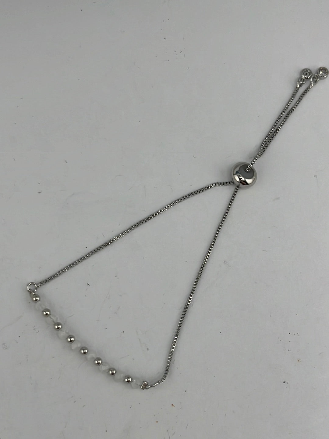 Silver tone adjustable bracelet with faceted moonstone beads.