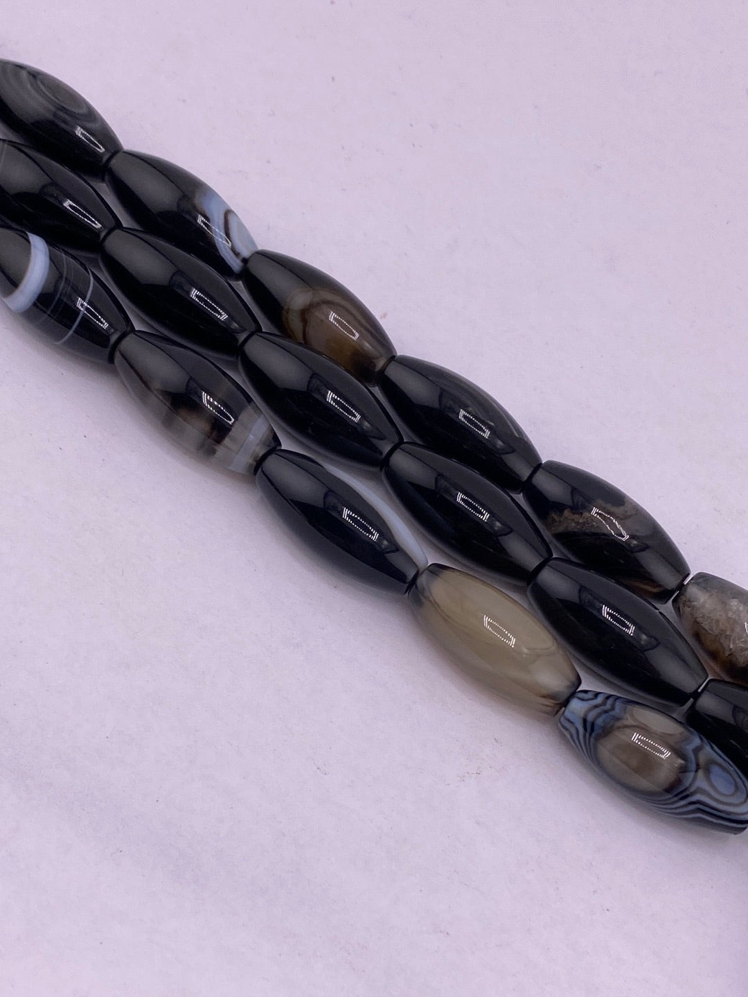 Black sardonyx, also known as black line agate, is cut into barrel shaped beads for sleek additions to your designs.