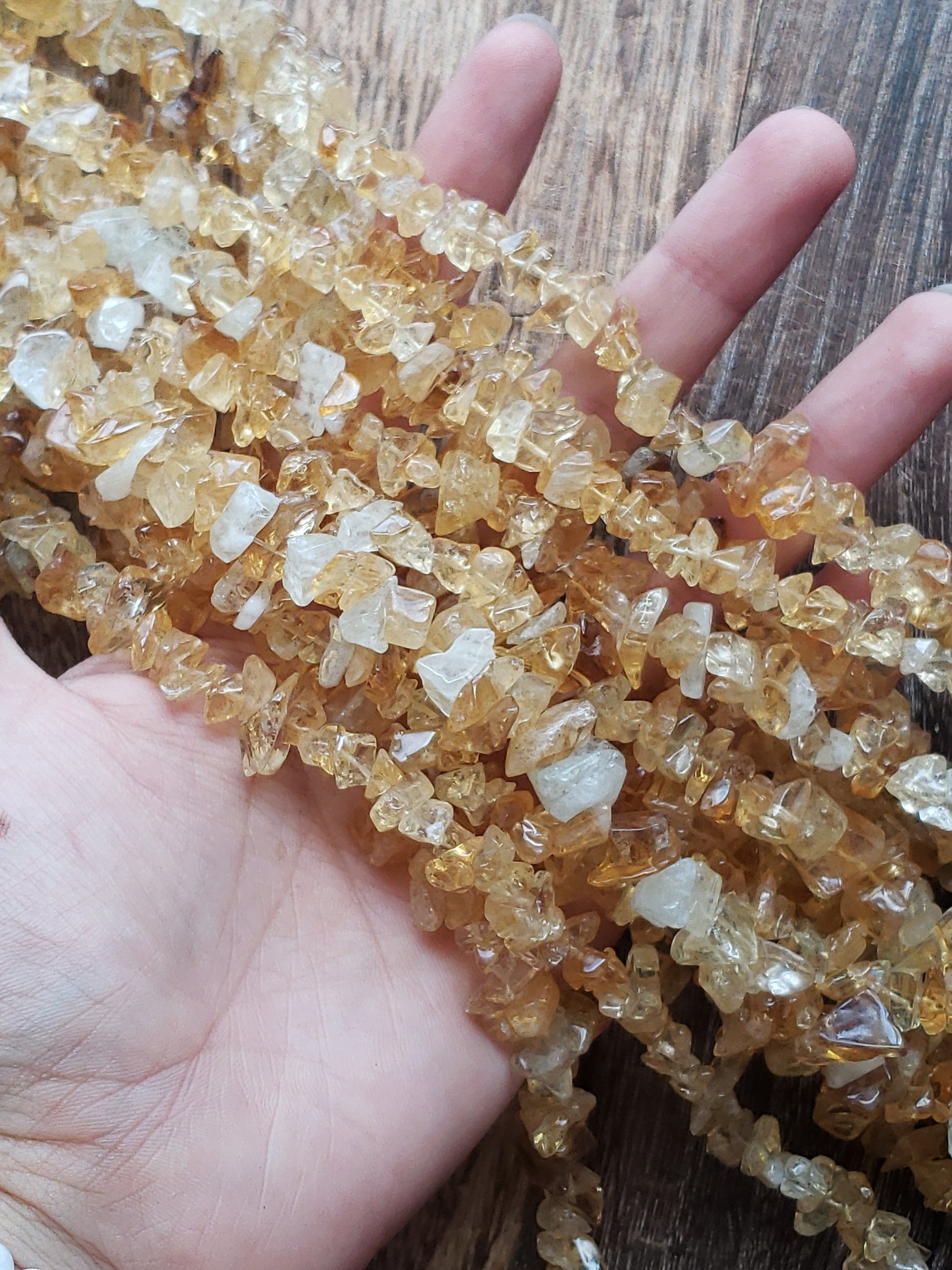 A 32" strand of citrine chips. The natural yellow and gold displayed in these tumbled chips and the natural shape bring a sunny, optimistic energy to any design.