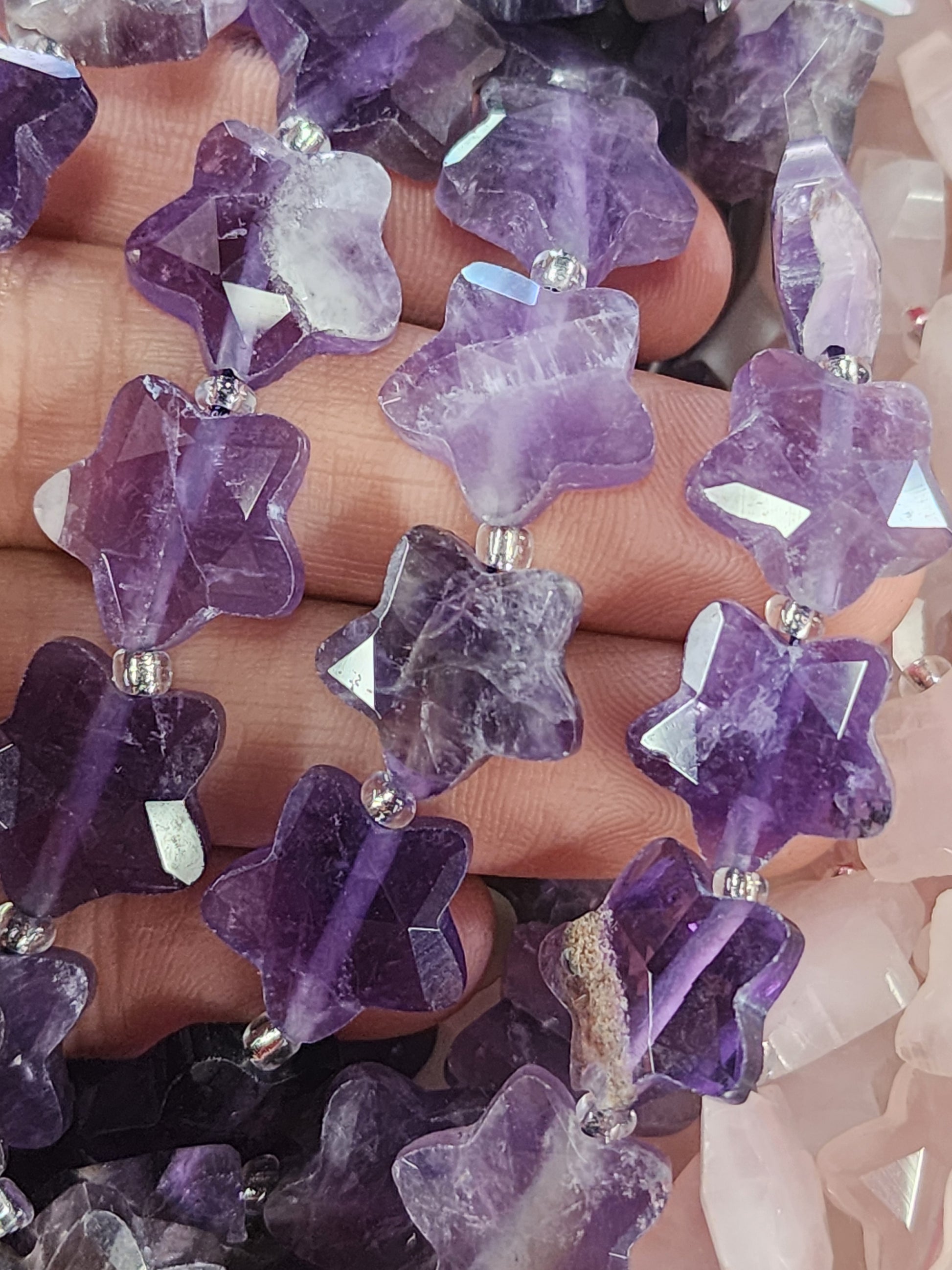 Amethyst is carved into star shaped beads and faceted to highlight its beautiful, natural purple color. Purple is said to bring balance to the crown chakra to calm the mind and bring inner peace.