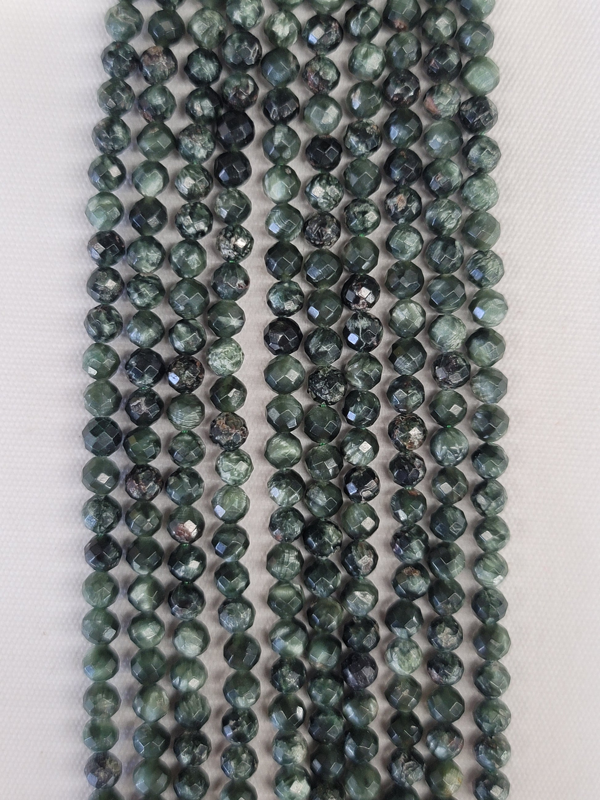Seraphinite is known for enlightenment, healing, and releasing negativity. Available in 4mm and 5mm faceted beads.