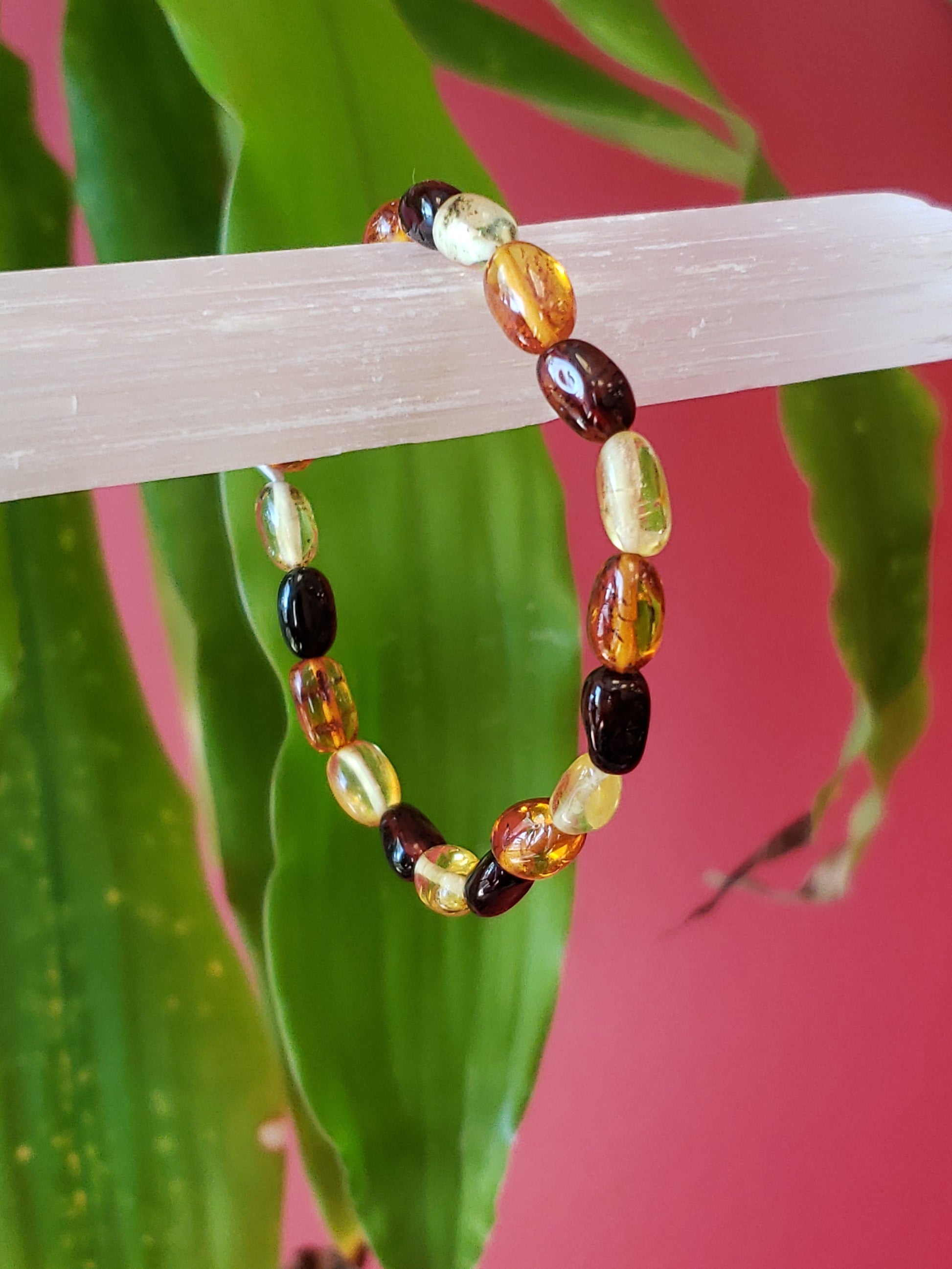 Baltic amber is shown in a variety of colors in this nugget stretch bracelet.