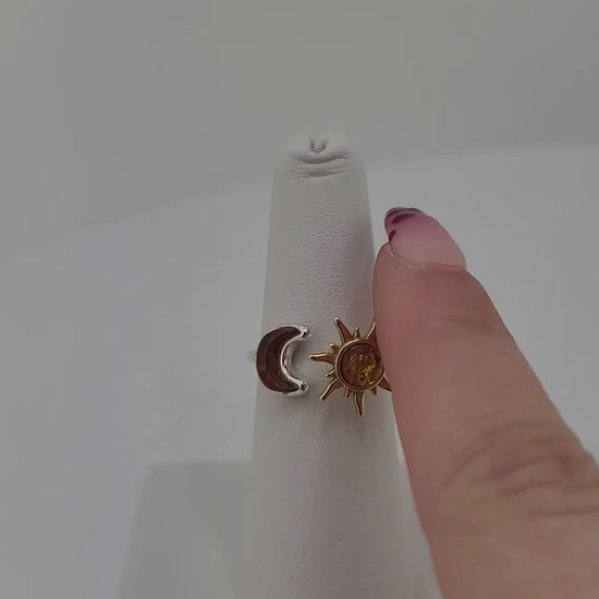 The sun and moon are captured in amber in this contemporary ring. The sun acts as a wheel in the wind, with gold plating to accentuate the warm tones. Amber is about 60 to 90 million years old and has been a valued gem throughout the ancient world.