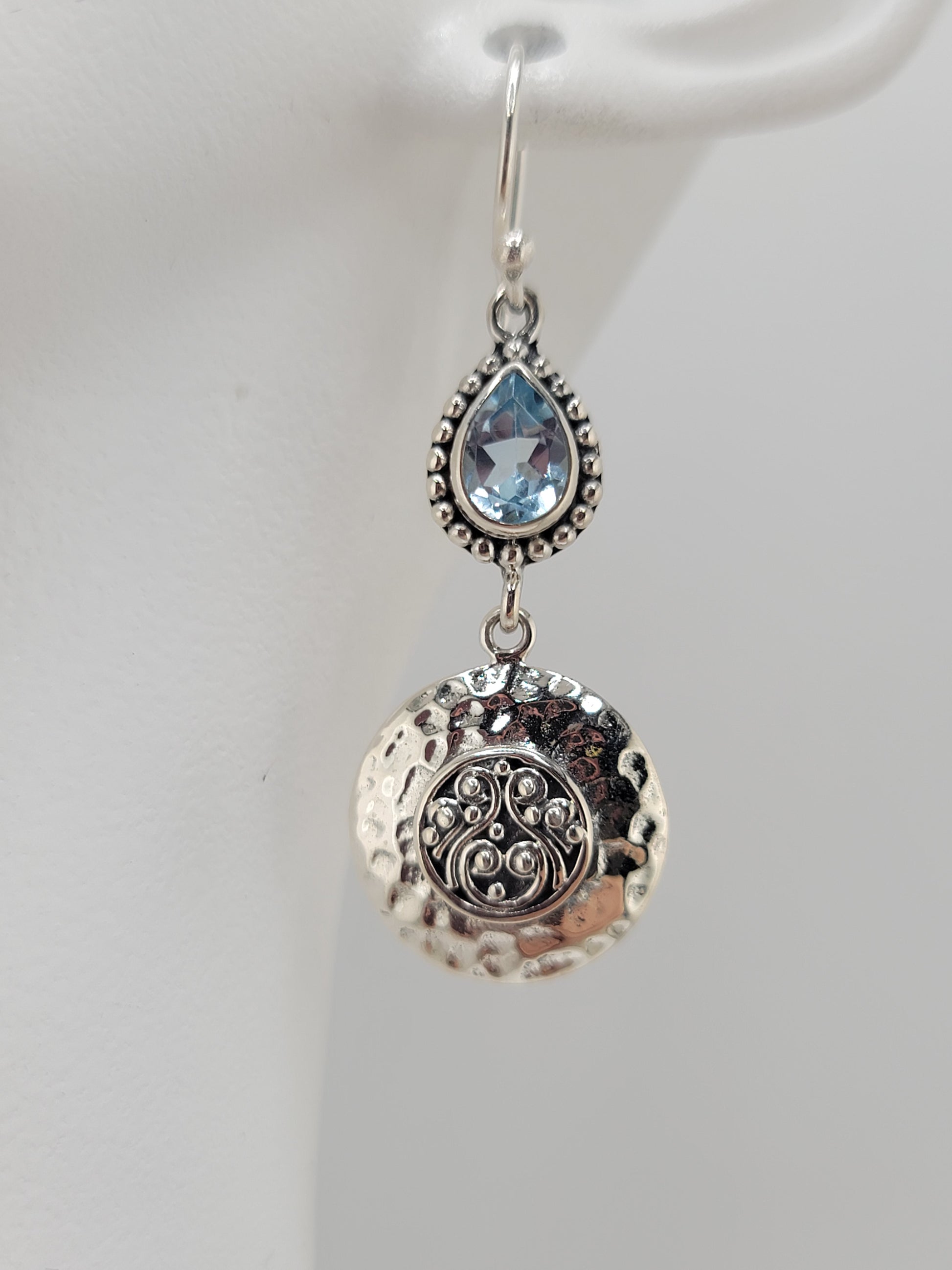 Faceted Blue Topaz teardrops with a detailed coin drop. These earrings make the perfect gift for a December baby! Approximately 1.25"