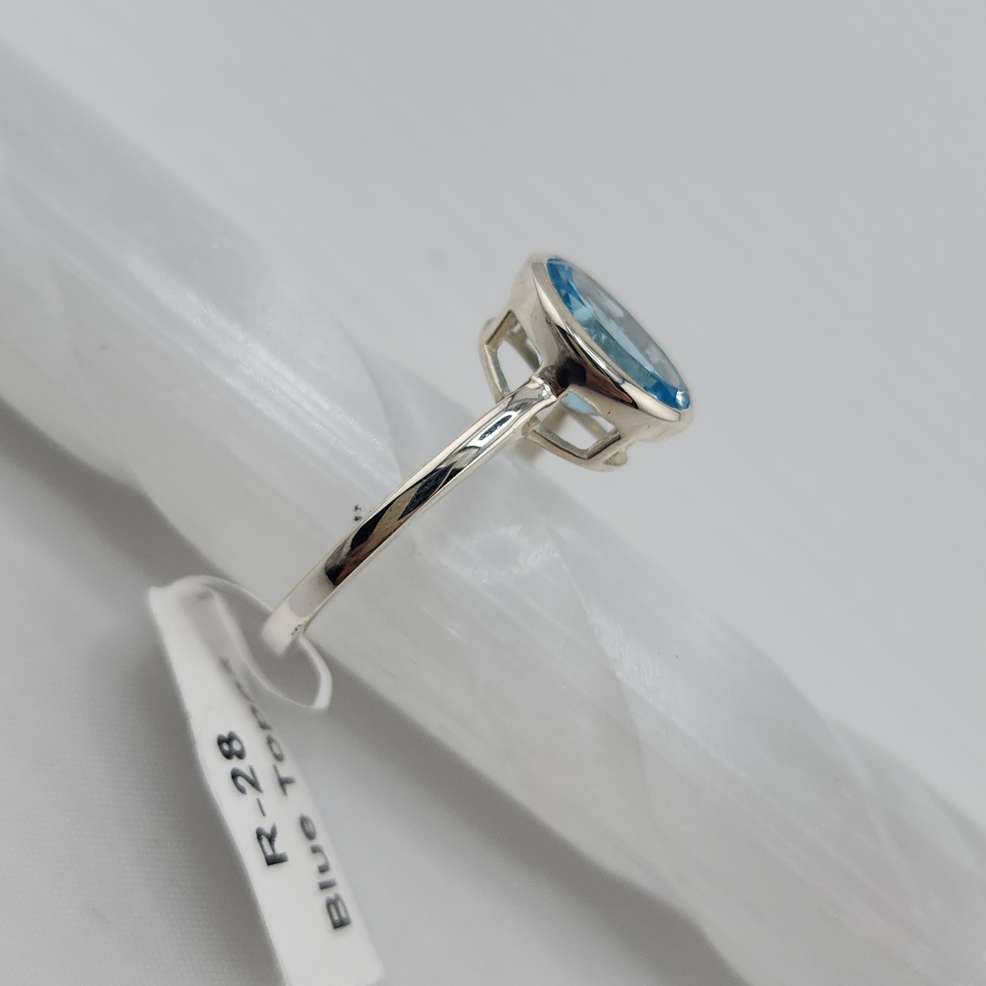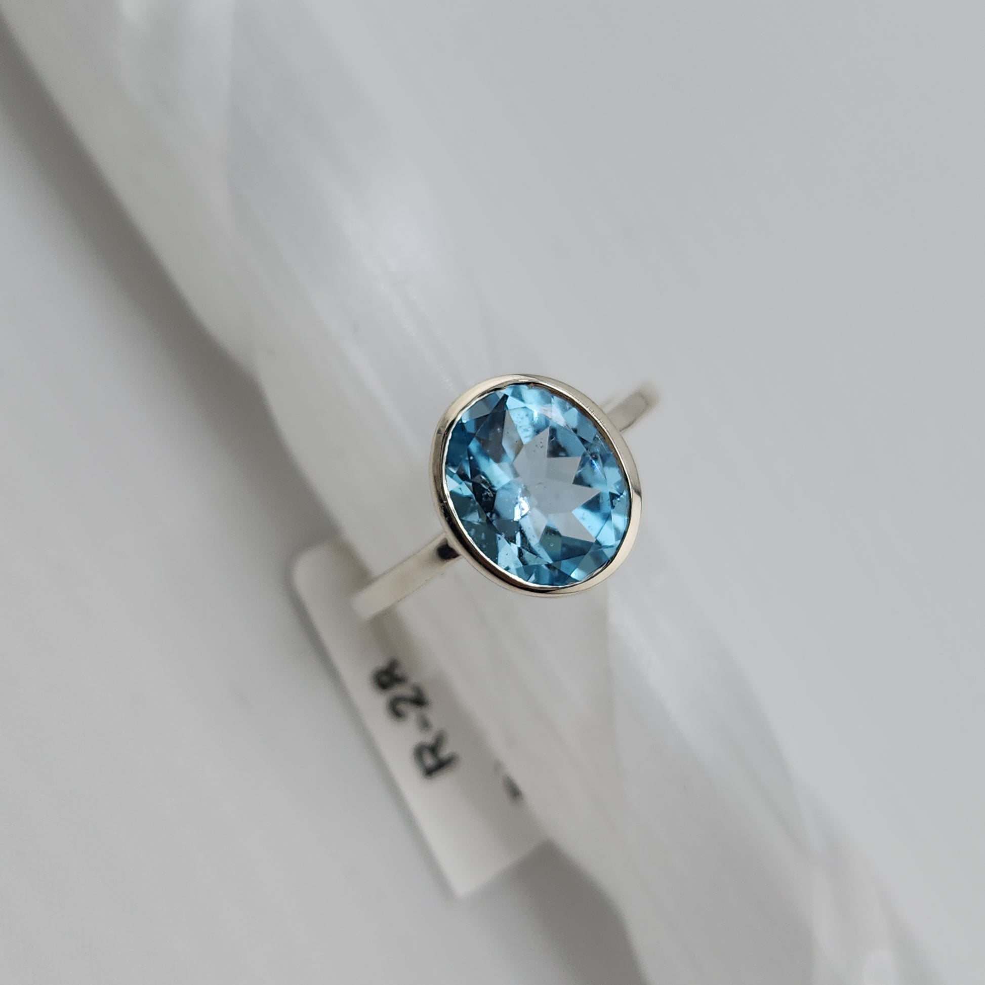 Equisitely faceted blue topaz is set into a simple sterling silver band.