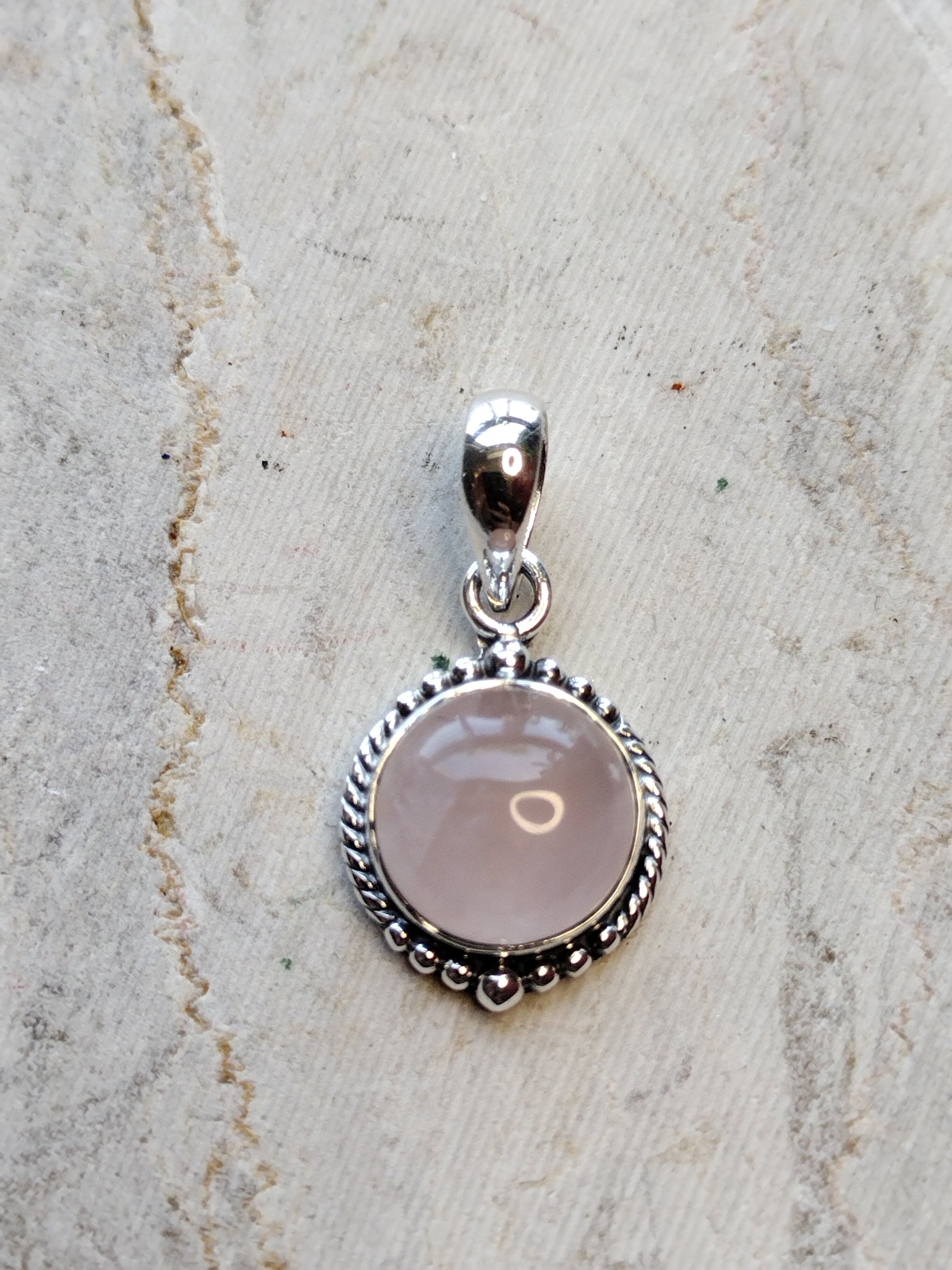 High quality rose quartz from madagscar is round cut and set into sterling silver for this classic pendant.