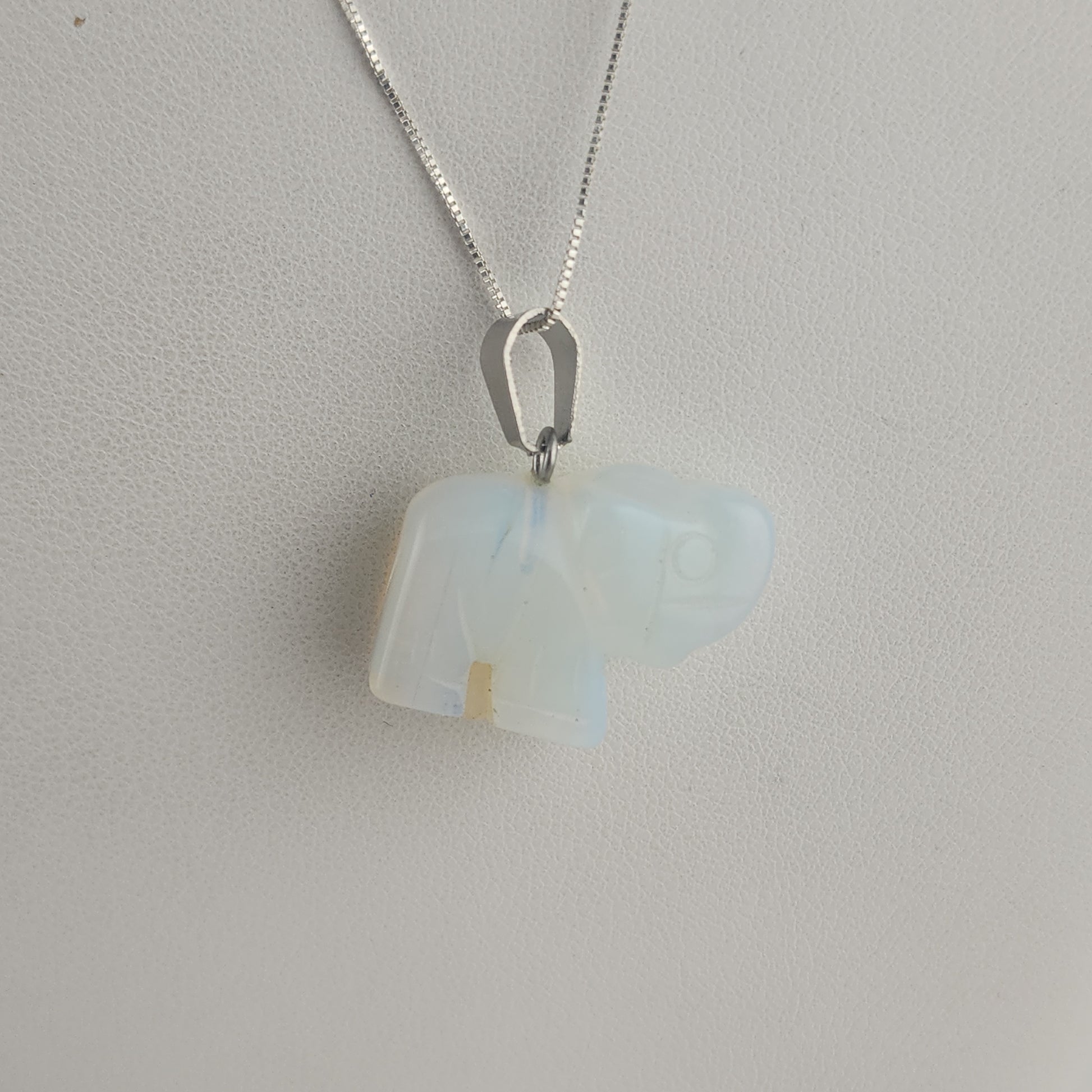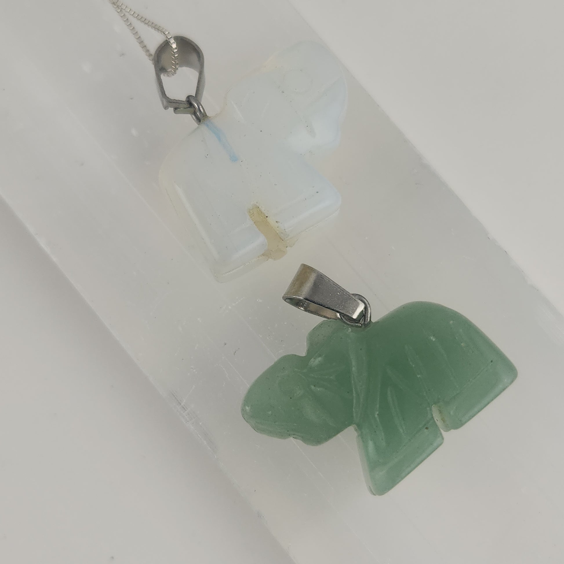 Two elephant pendants carved from green aventurine and opalite come with a sterling silver box chain.