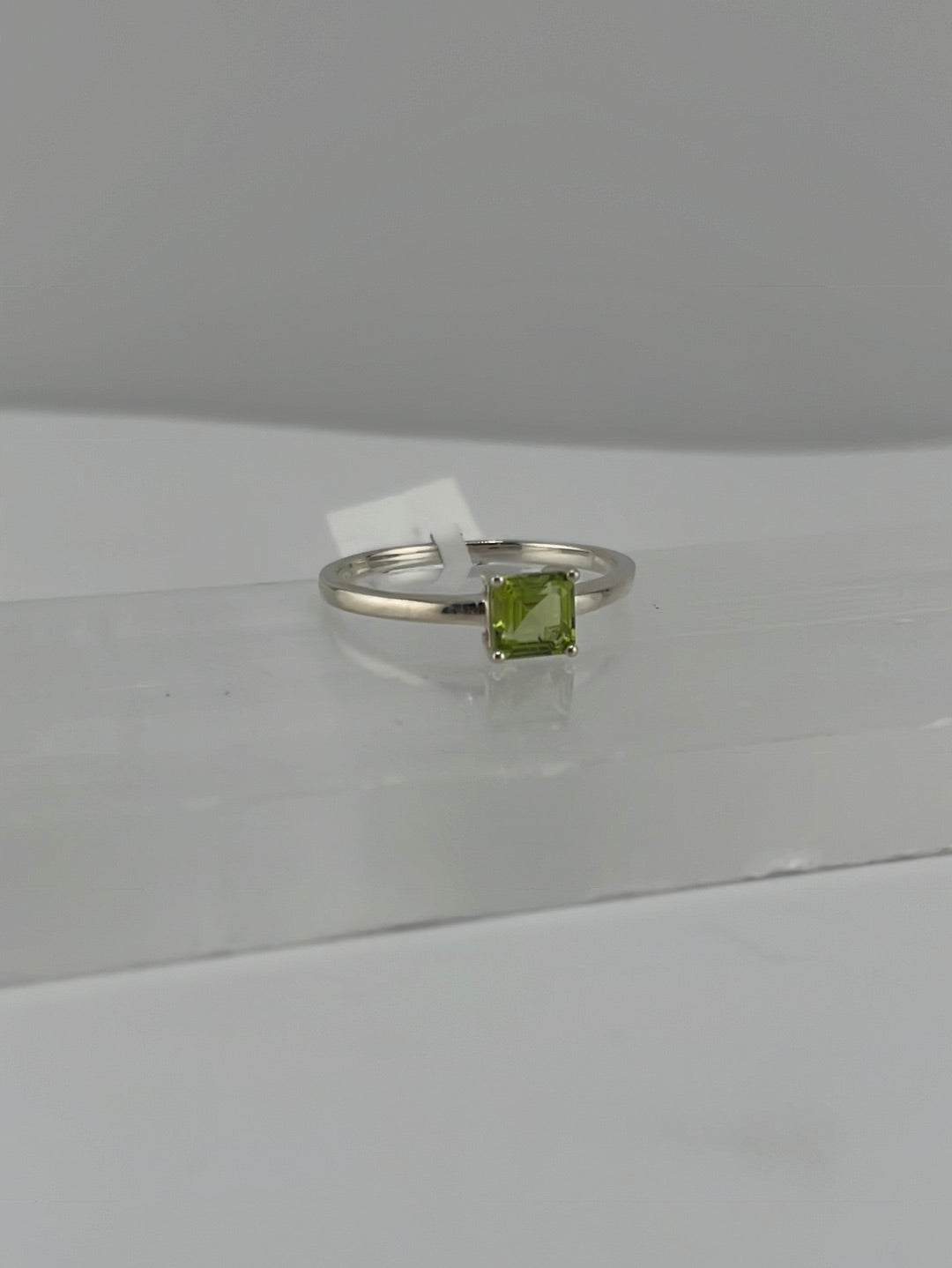 AAA faceted peridot square stone sitting in the middle of the thin sterling silver band