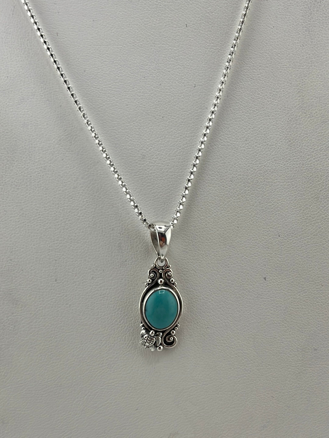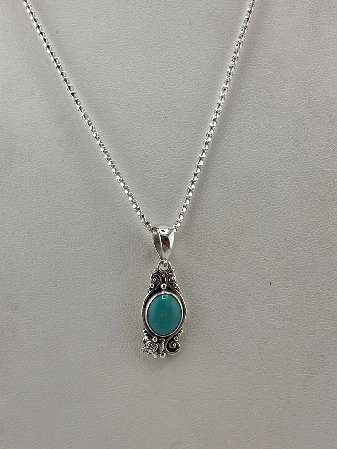 A sterling silver turquoise pendant, designed by Shlomo, with the signature turtle for luck and longevity at its base. This stone is best known for helping the carrier to set boundaries and speak their truth. It comes with an Italian made sterling silver coreana chain.