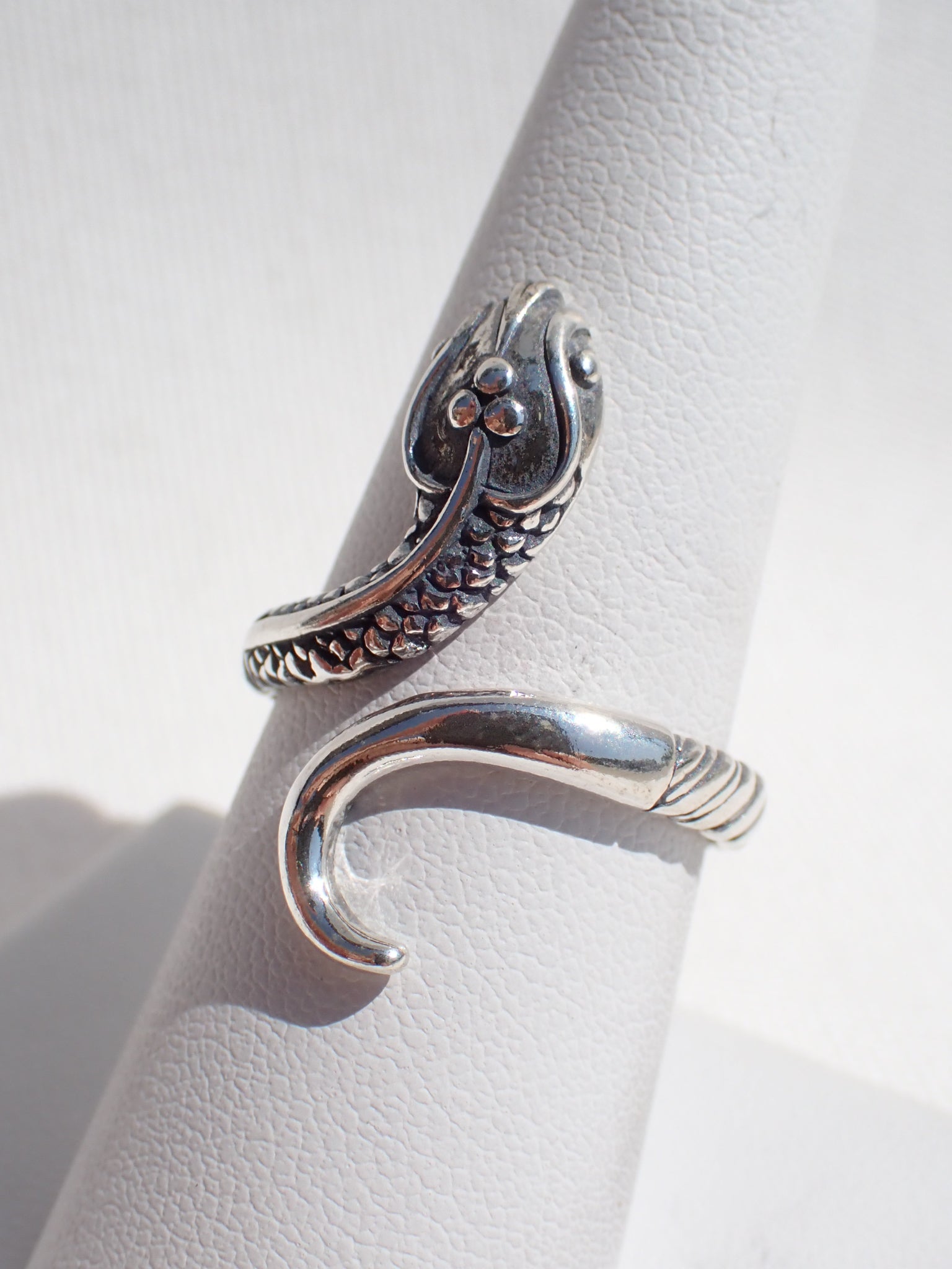 A sterling silver snake coils around the finger as a ring. This ring is beautifully crafted with detailed design.
