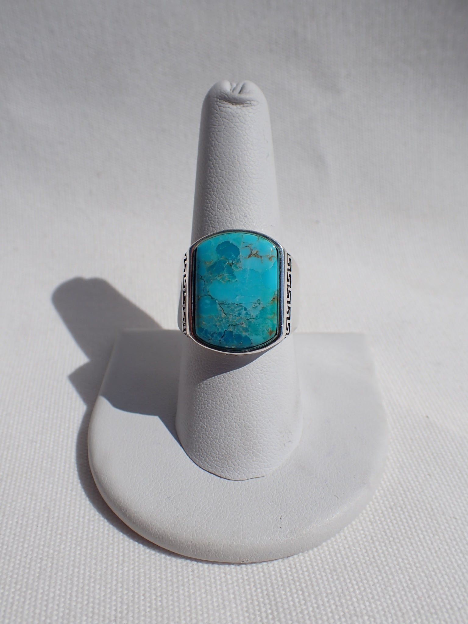 A sterling silver turquoise ring with large stone and tribal pattern etchings.