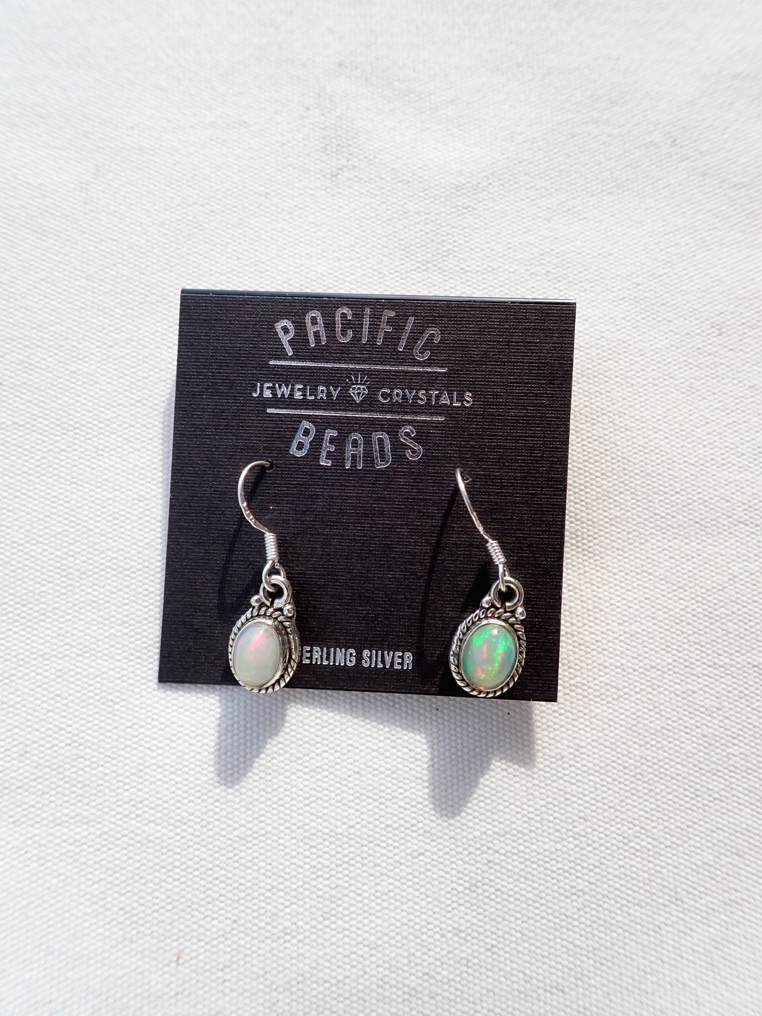 Oval cut opal from Ethiopia is set into sterling silver as delicate drop earrings.