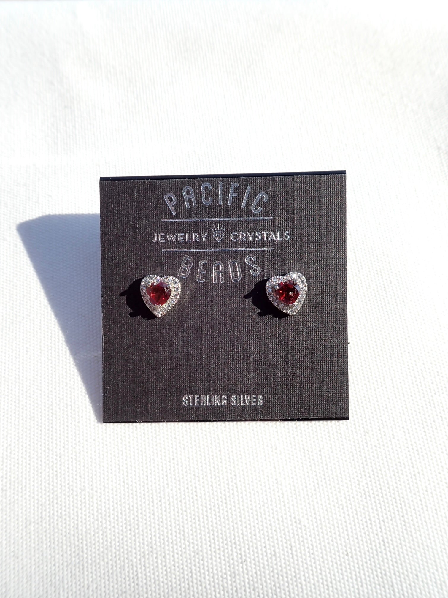 Sterling silver studs featuring a garnet heart framed by genuine zircon.