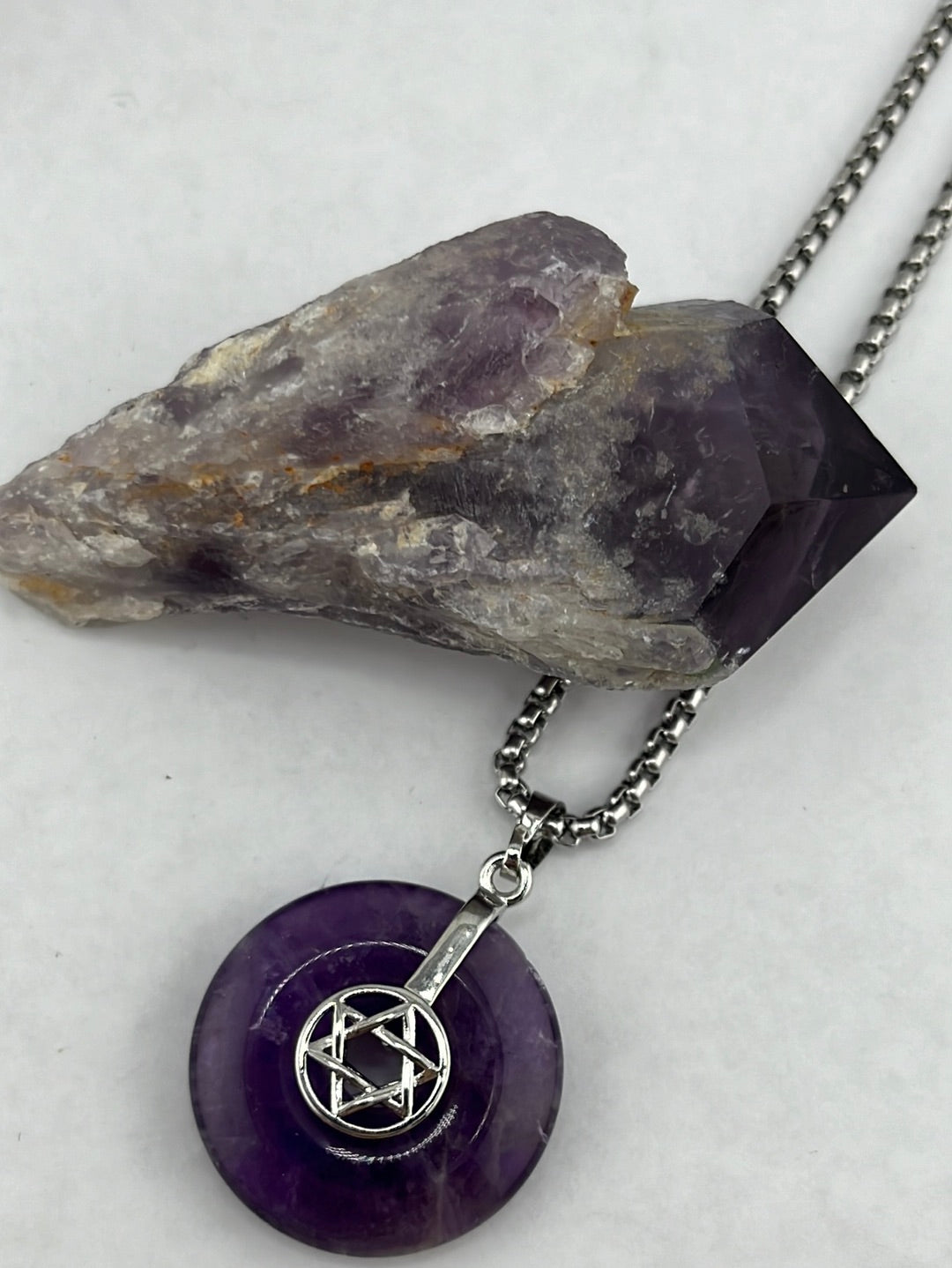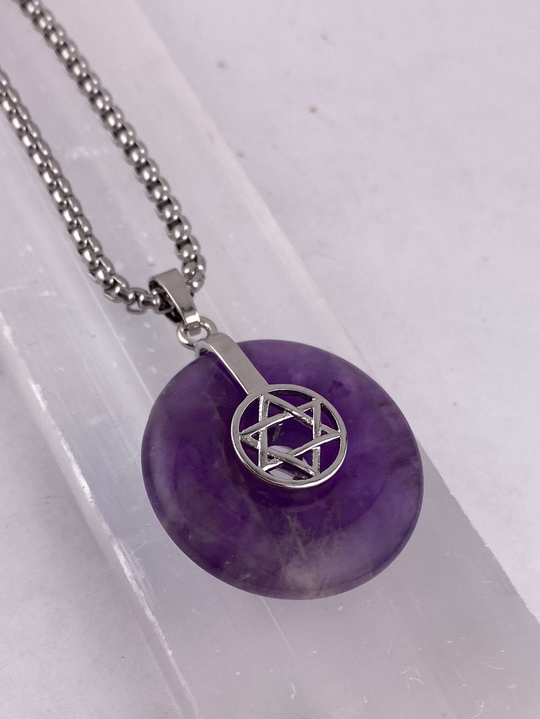 An amethyst pendant with the image of the star of david at its center dangles from a stainless steel chain.